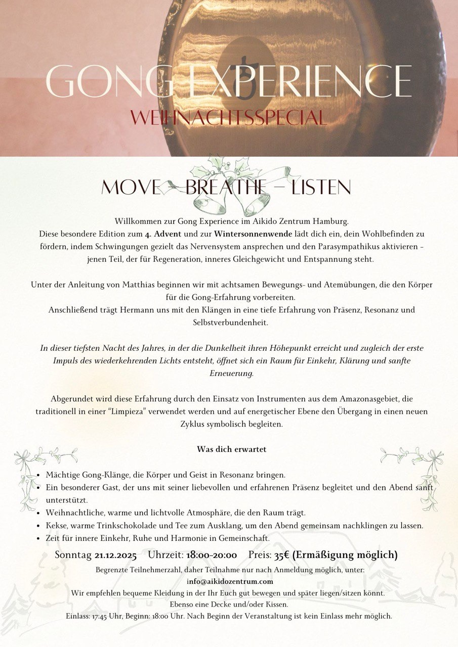 - Sonntag 21.12.25: „Gong-Experience – Weihnachts-Special“ (18:00 – 20:00 Uhr) mit Hermann & Matthias.